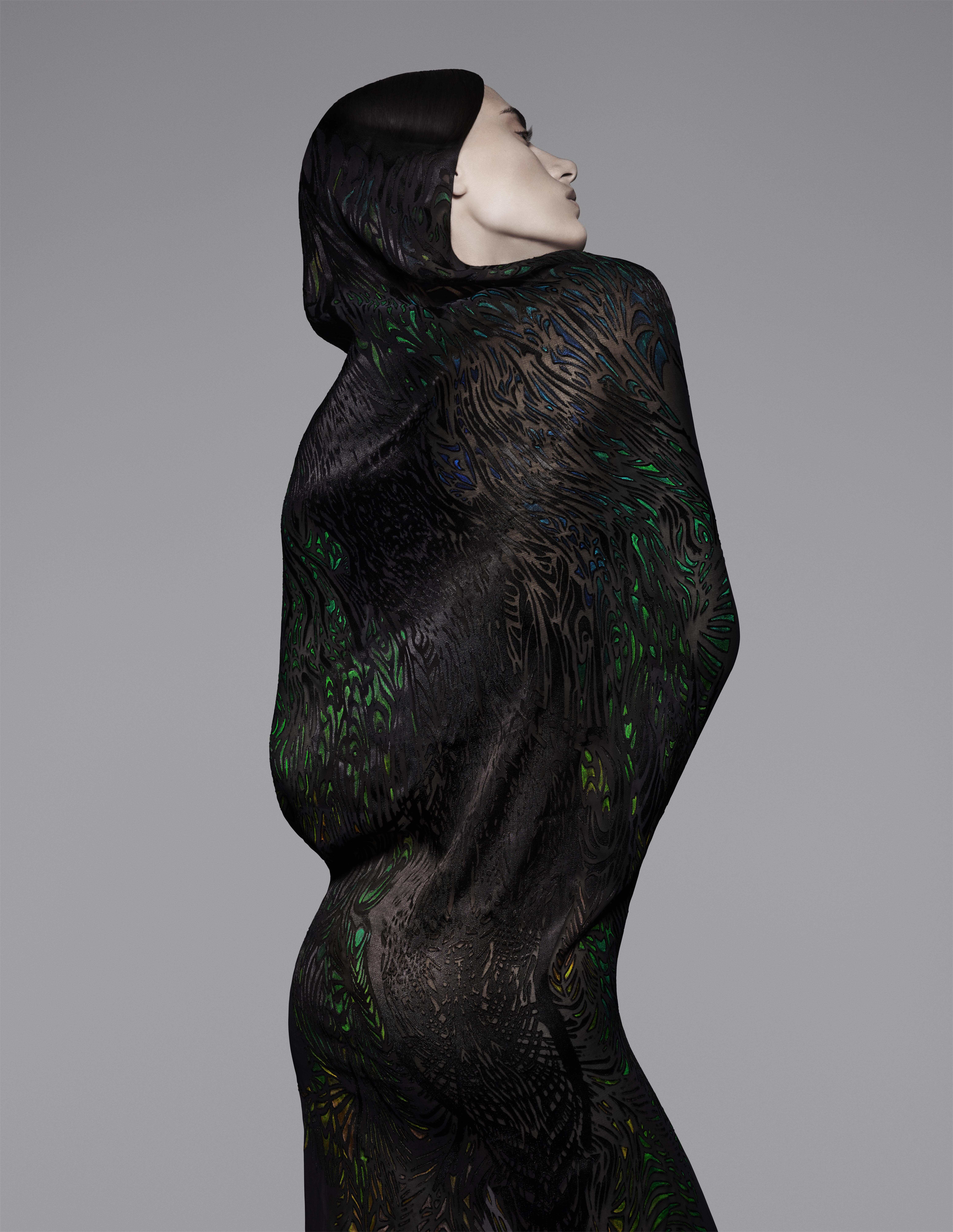 O lenço responde de formas diferentes em contato com o corpo. Nele foi trabalhado a técnica de devoré com a utilização de produtos químicos para criar áreas semi-transparentes no tecido de veludo.