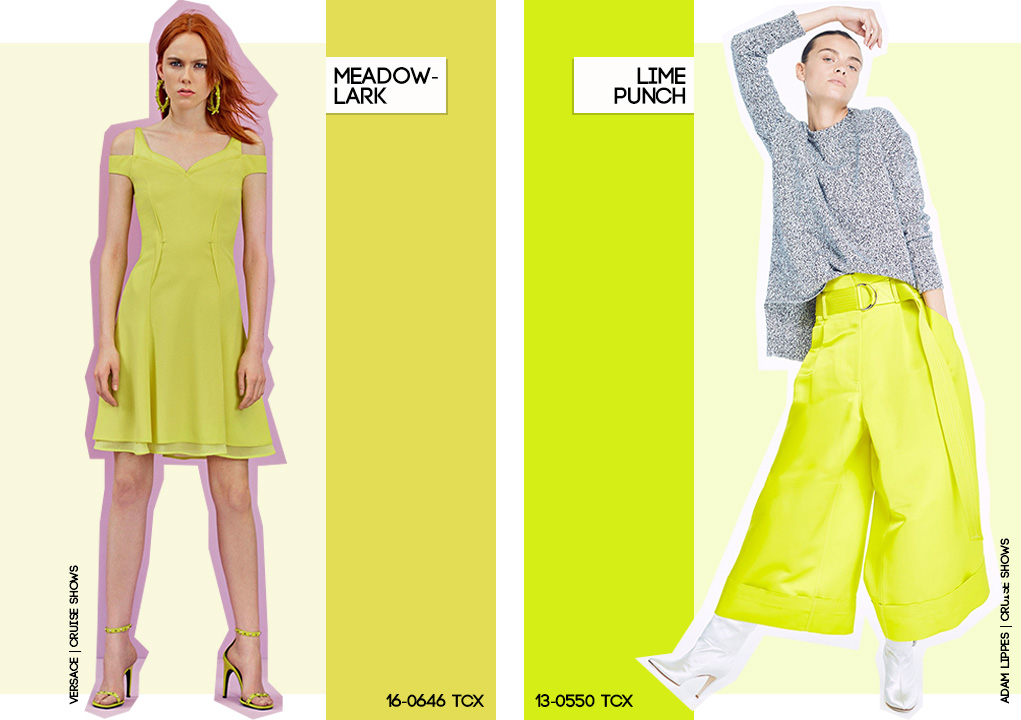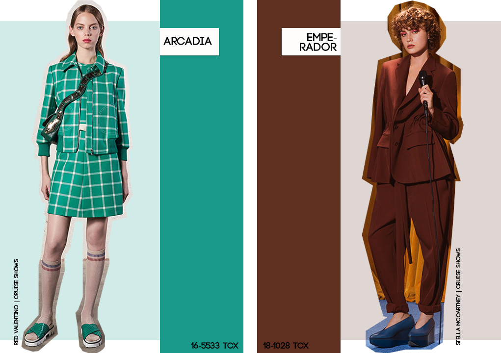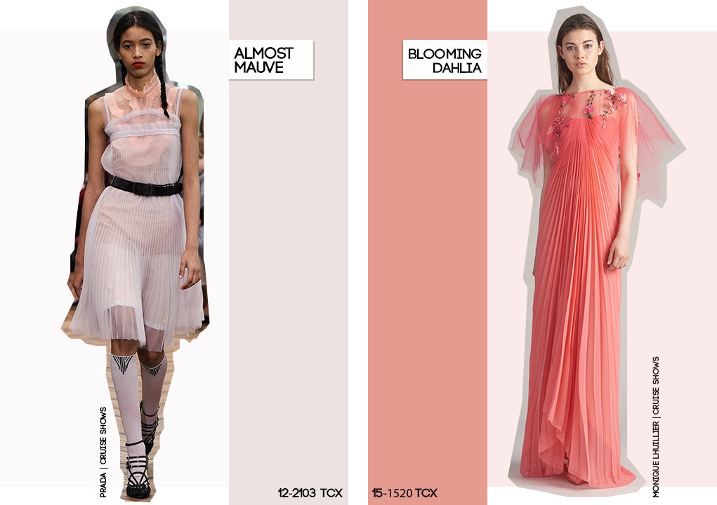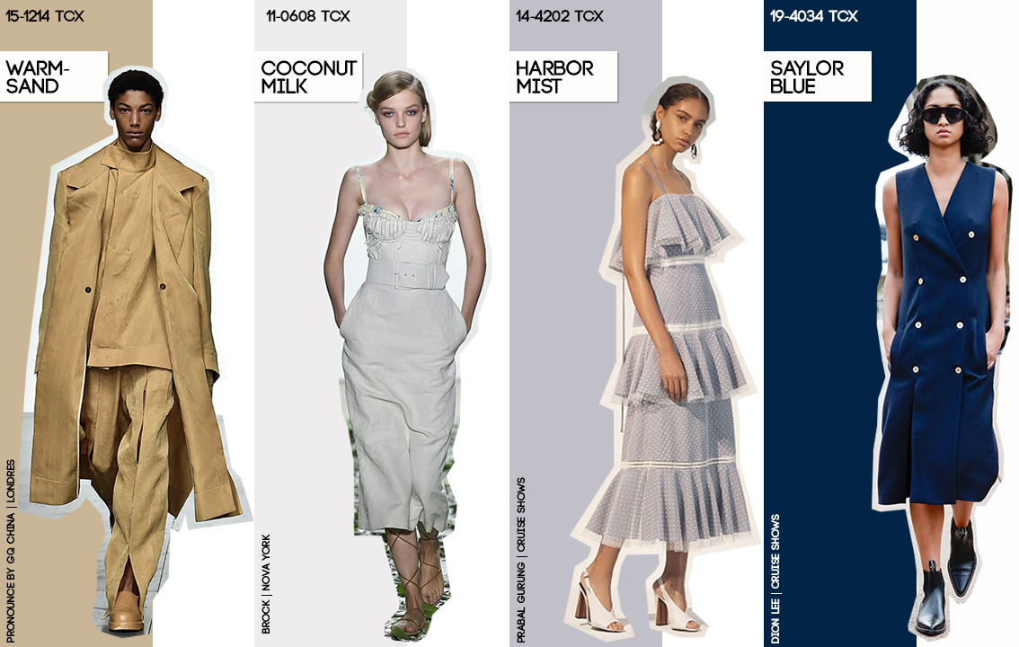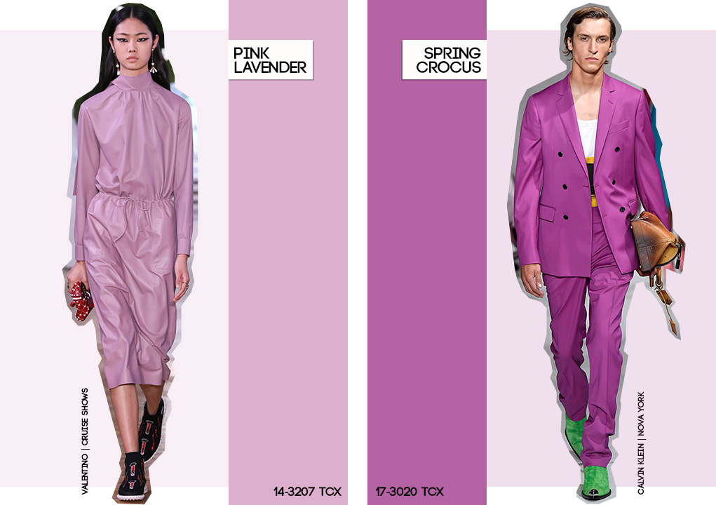 A suavidade aparece na cartela de cores da Pantone para a temporada através de tons como Almost MauveBlooming Dahlia e Pink Lavender, que apresentam variações delicadas para as famílias do laranja e do lilás. Já o Spring Crocus abre uma sequencia de cores vibrantes que se encerra através dos amarelos cítricos Meadowlark e Lime Punch. Os vermelhos Cherry Tomato e Chili Oil representam as tonalidades quentes da estação. Por fim, o Arcadia representa uma gama de verdes com leves nuances de turquesa, e o Emperador, por sua vez, marca presença como a única coloração terrosa do verão 2018/19.