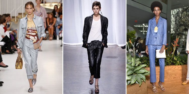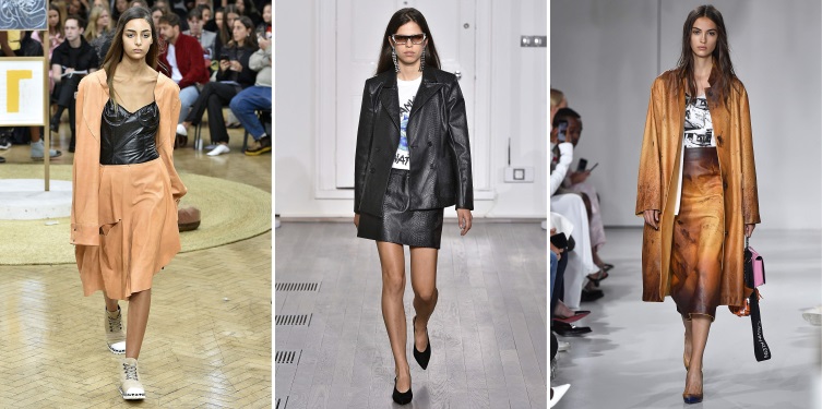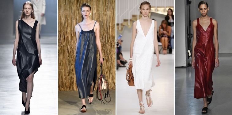 Normalmente associado as temporadas de frio, o uso de couros e sintéticos no vestuário vem ganhando força nos desfiles de verão 2018/19. Os materiais aparecem aplicados em peças características do verão, como vestidos, saias e shorts, podendo receber os mais variados tingimentos e detalhamentos de superfície.