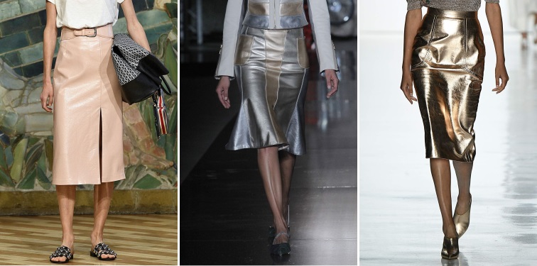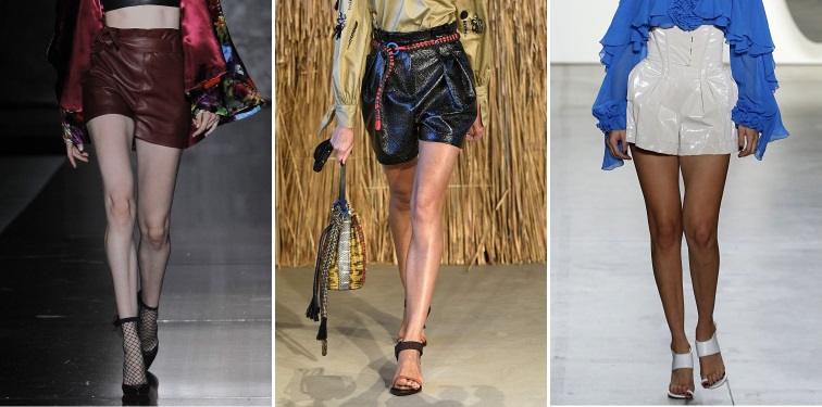 Reforçando as apostas para o verão 2018/19, saias mídi e shorts soltos também foram observados nas passarelas. Novamente aqui os couros e sintéticos de maior maleabilidade predominaram, sempre combinados a modelagens confortáveis. Além disso, apostas em metalizados e envernizados, reforçando uma estética oitentista, ganharam espaço nas superfícies.