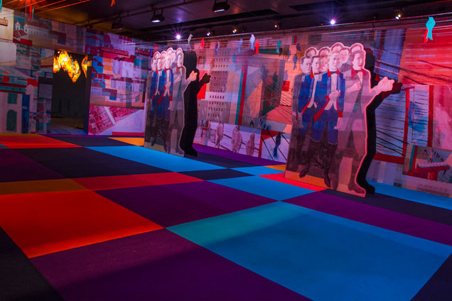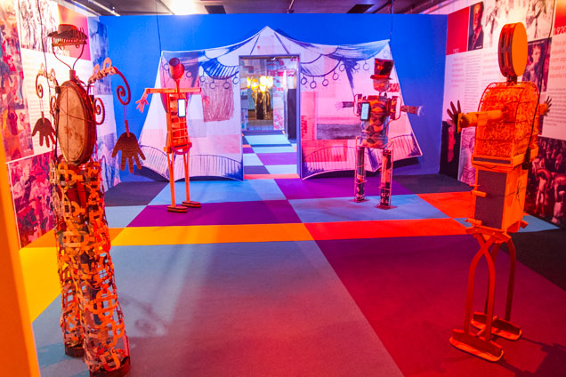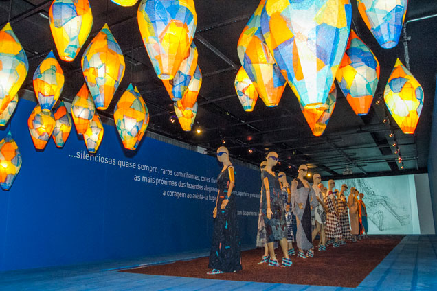 O quarto e último ambiente pode ser considerado o mais emocionante deles, pelo menos para quem gosta de moda. Nele, os aromas da infância do artista ganham vida, proporcionando uma experiência multissensorial – “a obra de Portinari tem cheiro do café que era plantado no interior de São Paulo, onde ele nasceu”, lembrou o estilista. Com chão coberto por duas toneladas de grãos de café e sob coloridos balões de São João confeccionados a partir de coadores de papel, Ronaldo apresenta alguns dos seus looks desfilados no último SPFW, repletos de cores, formas e visões desse importante nome do modernismo nacional, como a chegada do circo em uma cidade do interior. “O grande pincel de Portinari é o pincel da memória. Uma das coisas que mais me atrai nele é que ele sempre está dizendo para a gente ‘não deixe de lado a criança que você foi’.”