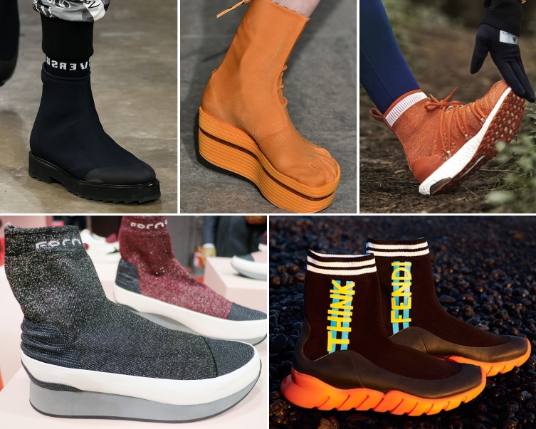 A inspiração em temas baseados na esportividade tem crescido mais a cada temporada. Materiais maleáveis e flexíveis utilizados nas construções de calçados revelam um visual urbano e confortável. No inverno 2018, esse tipo de matéria-prima é aposta forte e esteve presente em desfiles e feiras da estação.